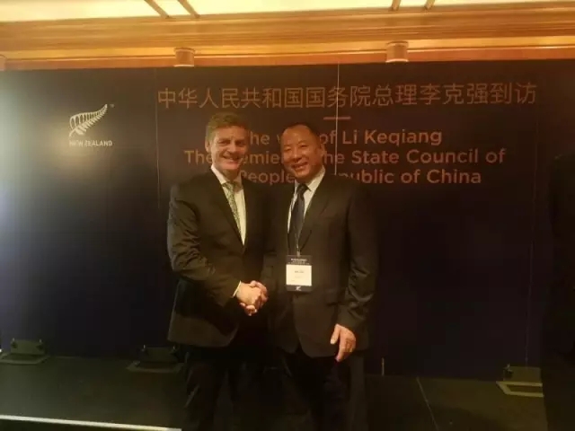 大莊園實(shí)業(yè)集團(tuán)董事長陳希濱與新西蘭總理比爾·英格利希在李克強(qiáng)總理訪問新西蘭歡迎午宴上會(huì)面握手并親切交談