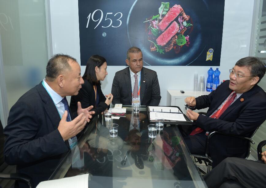 11月7日上午,陳希濱董事長陪同黑龍江省省長王文濤、副省長程志明,與參加進博會的全球500強企業巴西JBS集團CEO雷納托·科斯塔舉行了會談。會談中,王文濤省長表示黑龍江省政府將積極推動JBS與黑龍江企業開展合作,推動龍江畜牧業及肉制品加工業更好發展,實現互利共贏。